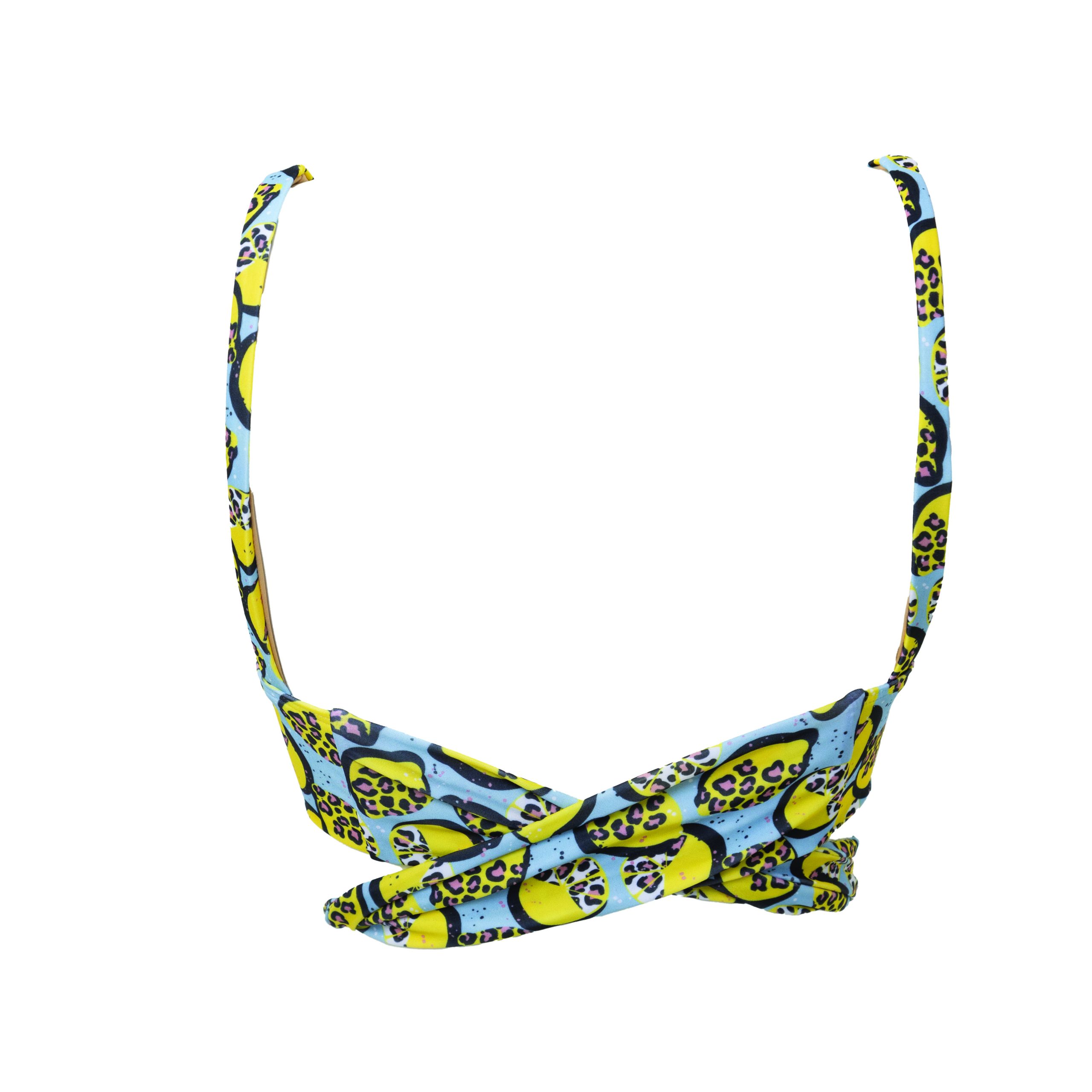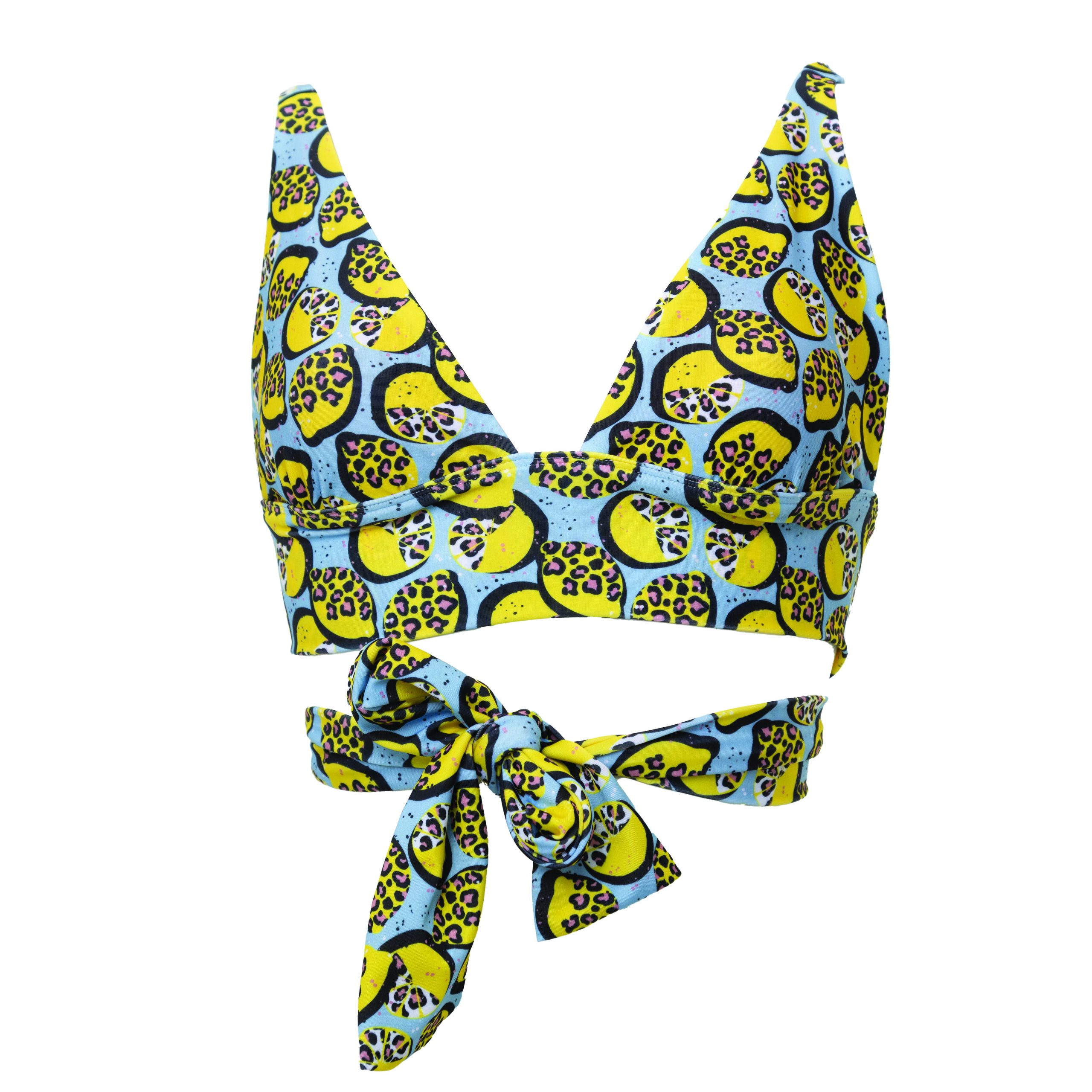 A beautiful, supportive bikini with an additional elegant bow tied at the front or back. A gorgeous cross-over detail at the back makes this piece functional and comfortable. Produced from ultra soft fabric made from recycled plastic, this top supports A-cup to DD-cup. Our swimwear is made from premium fabric which is UV protective (UPF 50+) and ultra-chlorine resistant. Our limited edition leopard lemons print has been printed locally specially for Shades of Jade.
